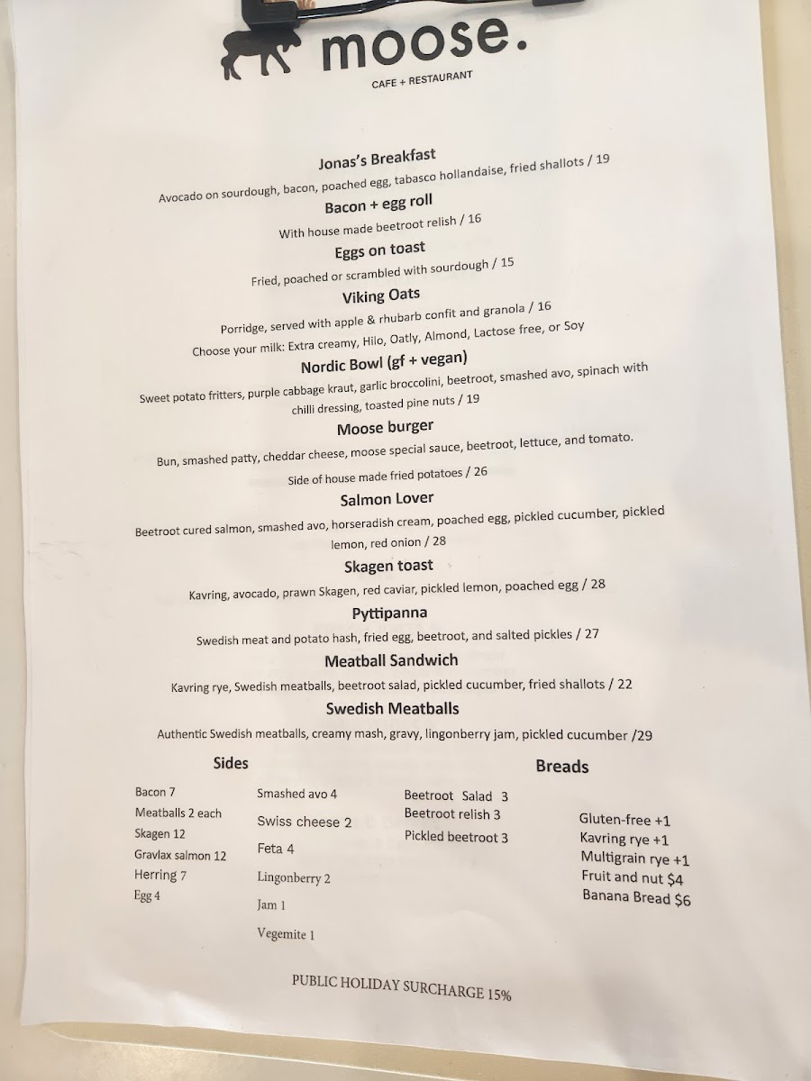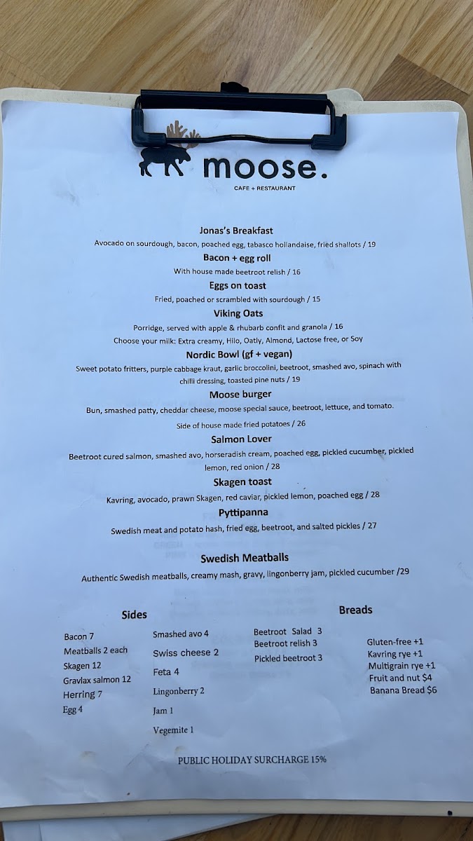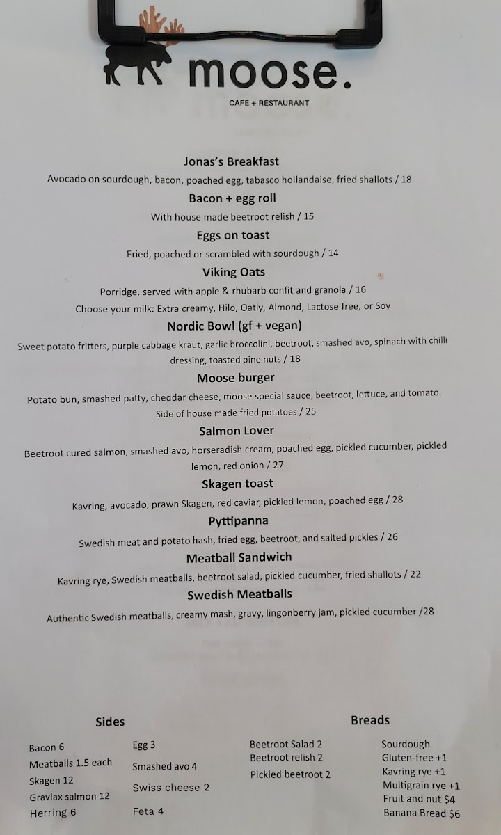 The menu at Moose Claremont offers a selection of cafe and restaurant-style dishes suitable for breakfast, light meals, and casual dining throughout the day. It features a variety of breads including gluten-free options, kavring rye, multigrain rye, fruit and nut loaf, and banana bread, allowing for customized choices.