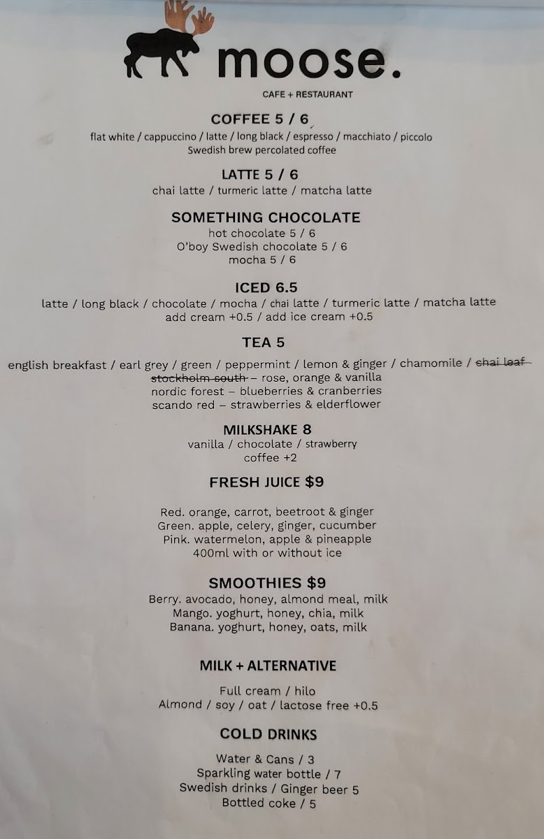 Popular menu highlights include Swedish Meatballs, Toast Skagen, Eggs on Toast, and the Moose Burger. Beverage options consist of coffee selections like cappuccino, flat white, and iced mocha, as well as freshly squeezed juices, catering to a variety of preferences for both coffee breaks and meal times.